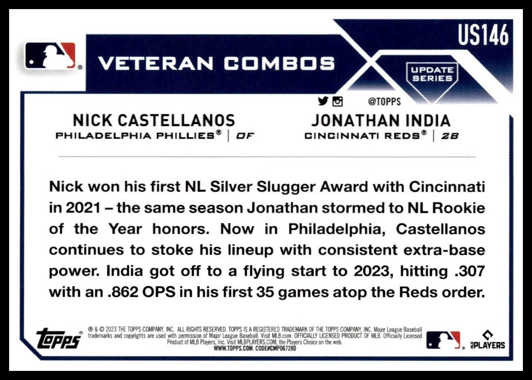 This Baseball card, from 2023 is part of the Topps Update card set. Former Teammate Meet Up (Nick Castellanos / Jonathan India) is featured and has a card number of US146.