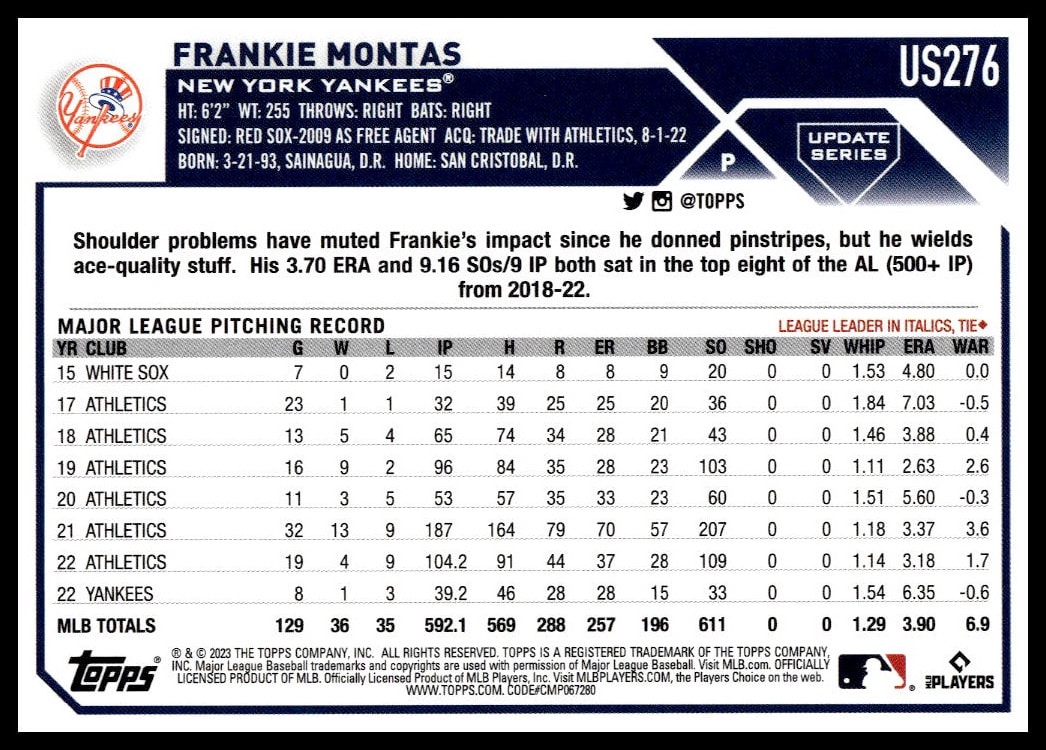 This BaseballΒ card, from 2023 is part of the Topps UpdateΒ card set. Frankie Montas is featured and has a card number of US276.