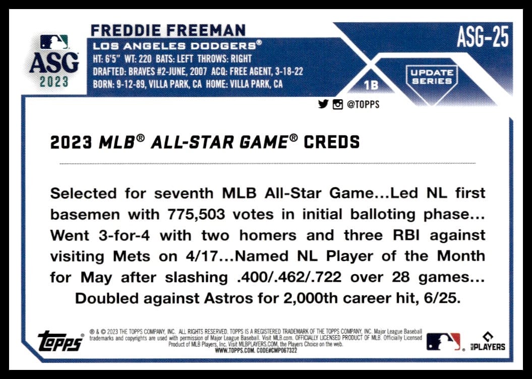 This BaseballΒ card, from 2023 is part of the Topps UpdateΒ card set. Freddie Freeman is featured and has a card number of ASG-25.