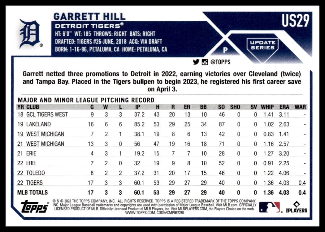 This Baseball card, from 2023 is part of the Topps Update card set. Garrett Hill is featured and has a card number of US29.