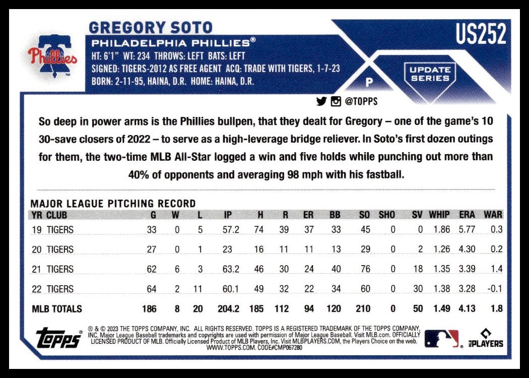 This Baseball card, from 2023 is part of the Topps Update card set. Gregory Soto is featured and has a card number of US252.