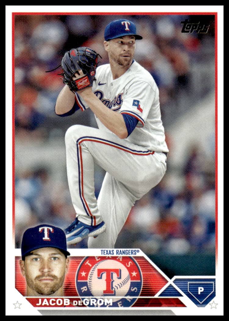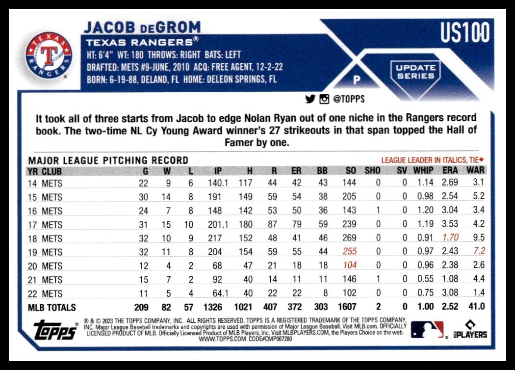 This Baseball card, from 2023 is part of the Topps Update card set. Jacob deGrom is featured and has a card number of US100.