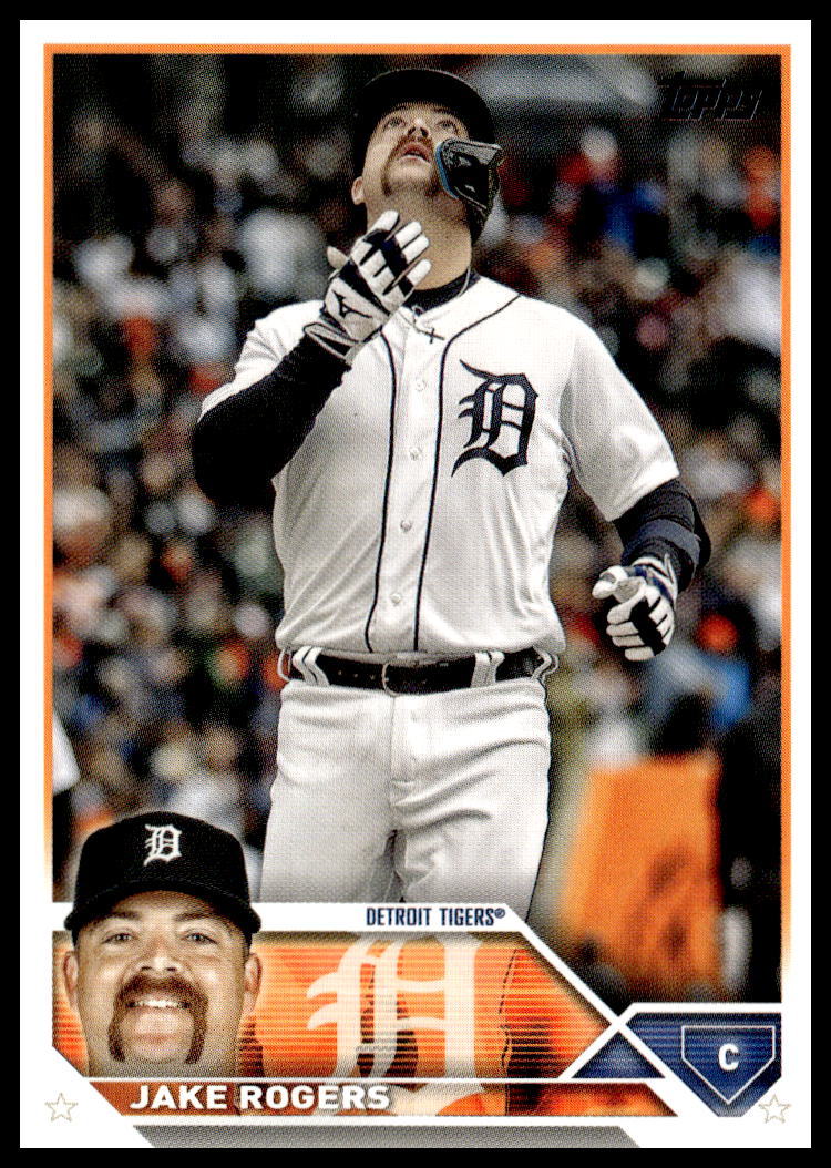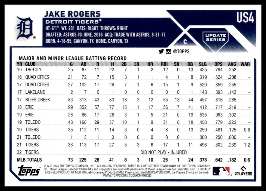 This Baseball card, from 2023 is part of the Topps Update card set. Jake Rogers is featured and has a card number of US4.