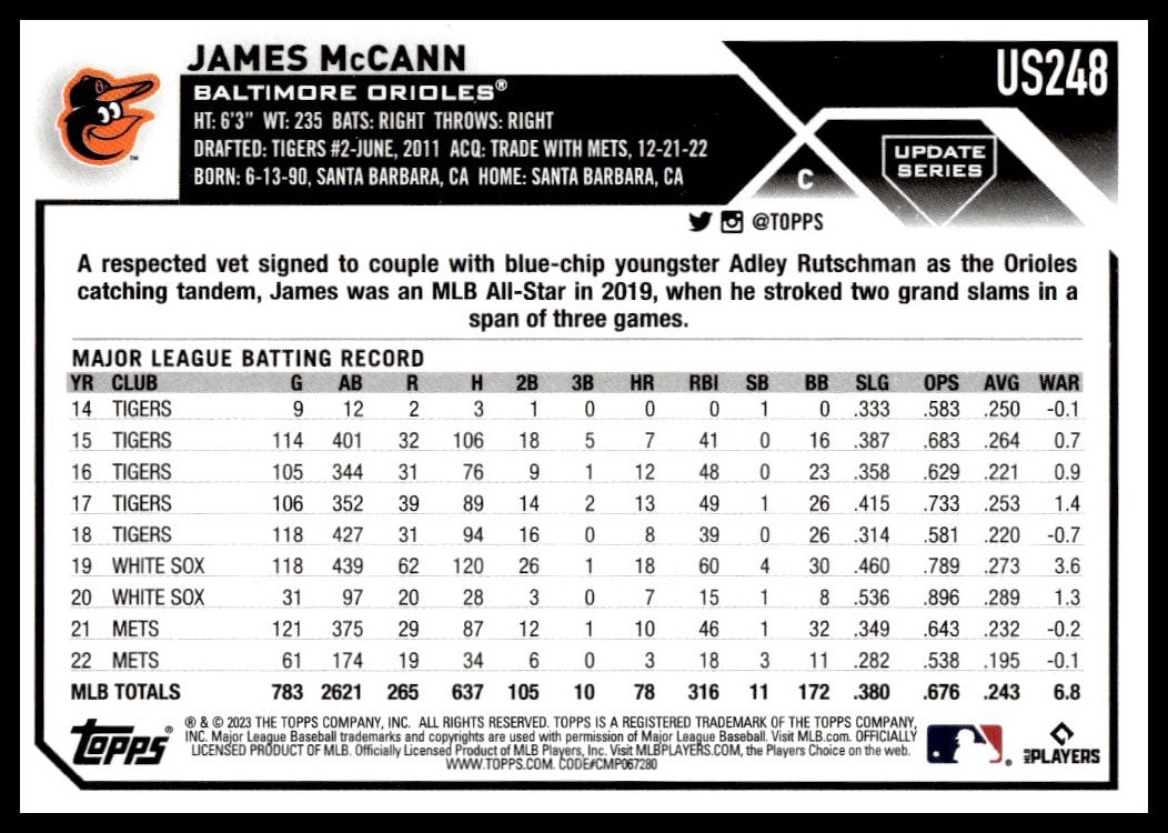 This Baseball card, from 2023 is part of the Topps Update card set. James McCann is featured and has a card number of USC7.