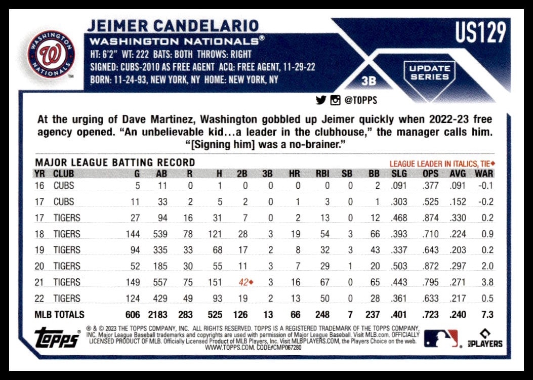 This BaseballΒ card, from 2023 is part of the Topps UpdateΒ card set. Jeimer Candelario is featured and has a card number of US129.
