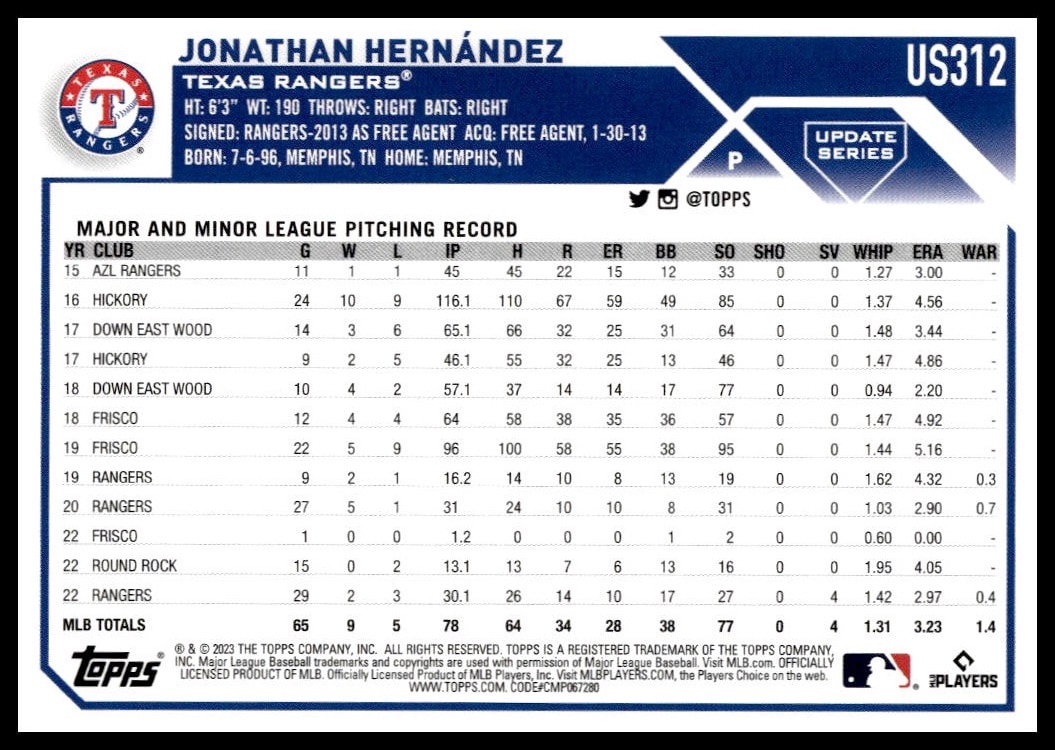 This Baseball card, from 2023 is part of the Topps Update card set. Jonathan Hernandez is featured and has a card number of US312.