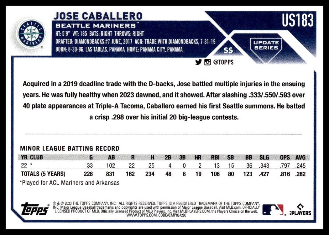This Baseball card, from 2023 is part of the Topps Update card set. Jose Caballero is featured and has a card number of US183.
