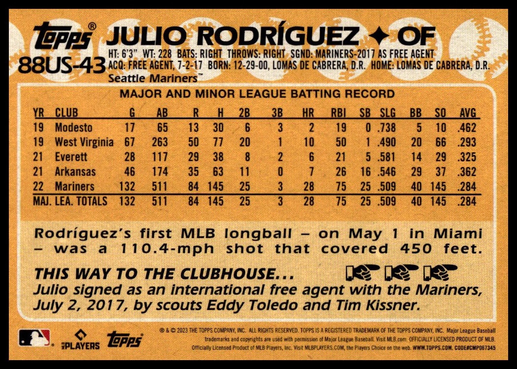 This Baseball card, from 2023 is part of the Topps Update card set. Julio Rodriguez is featured and has a card number of 88US-43.