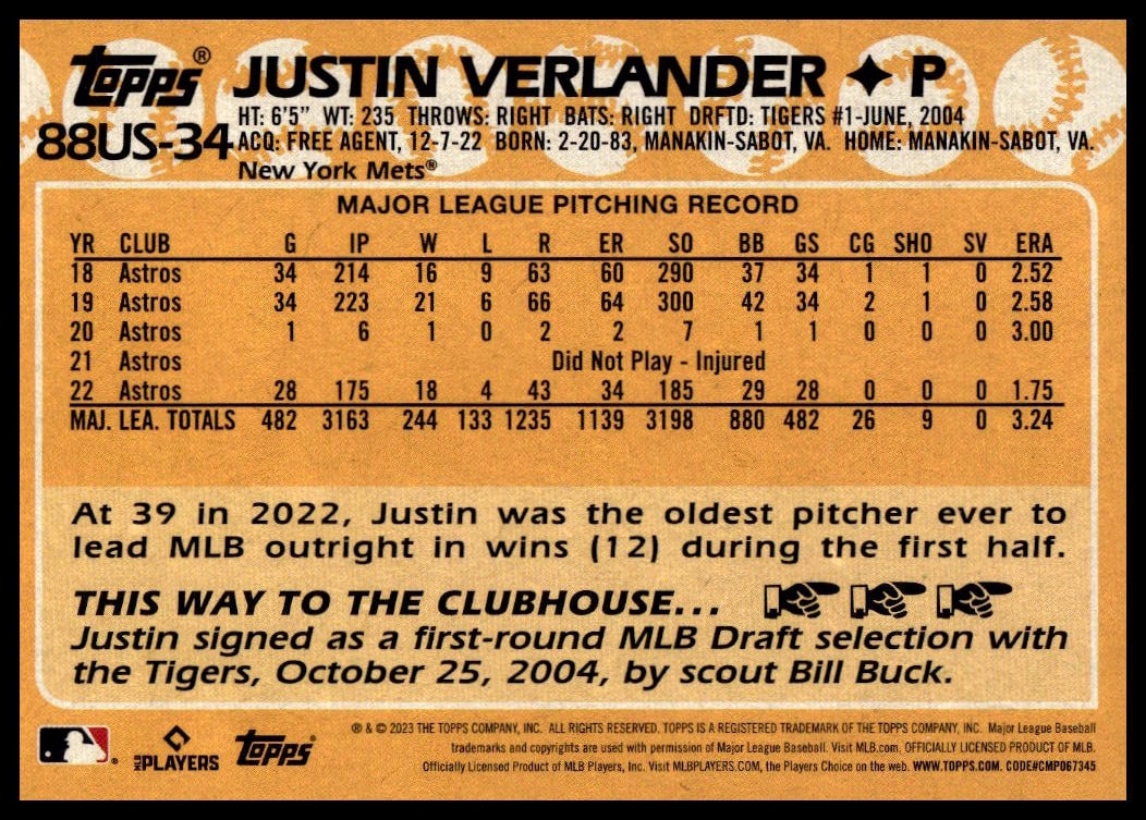2023 Topps Update Justin Verlander 1988 #88US-34