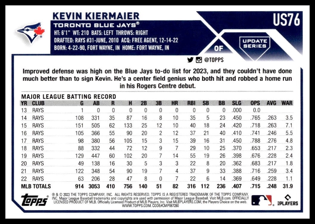 This BaseballΒ card, from 2023 is part of the Topps UpdateΒ card set. Kevin Kiermaier is featured and has a card number of US76.