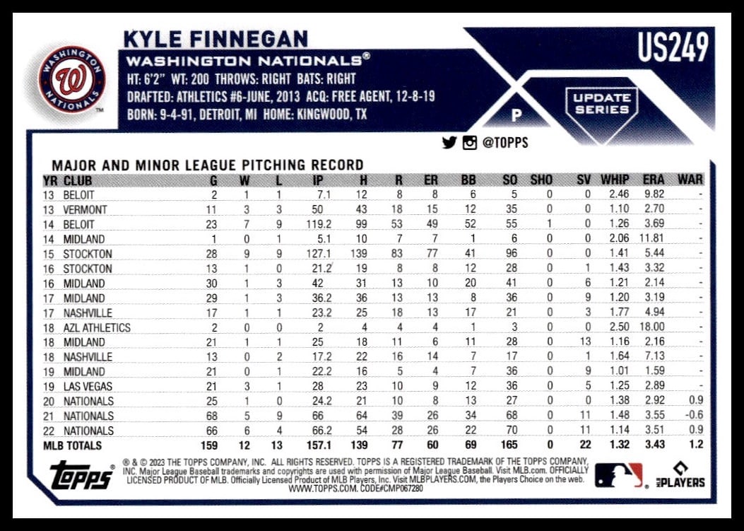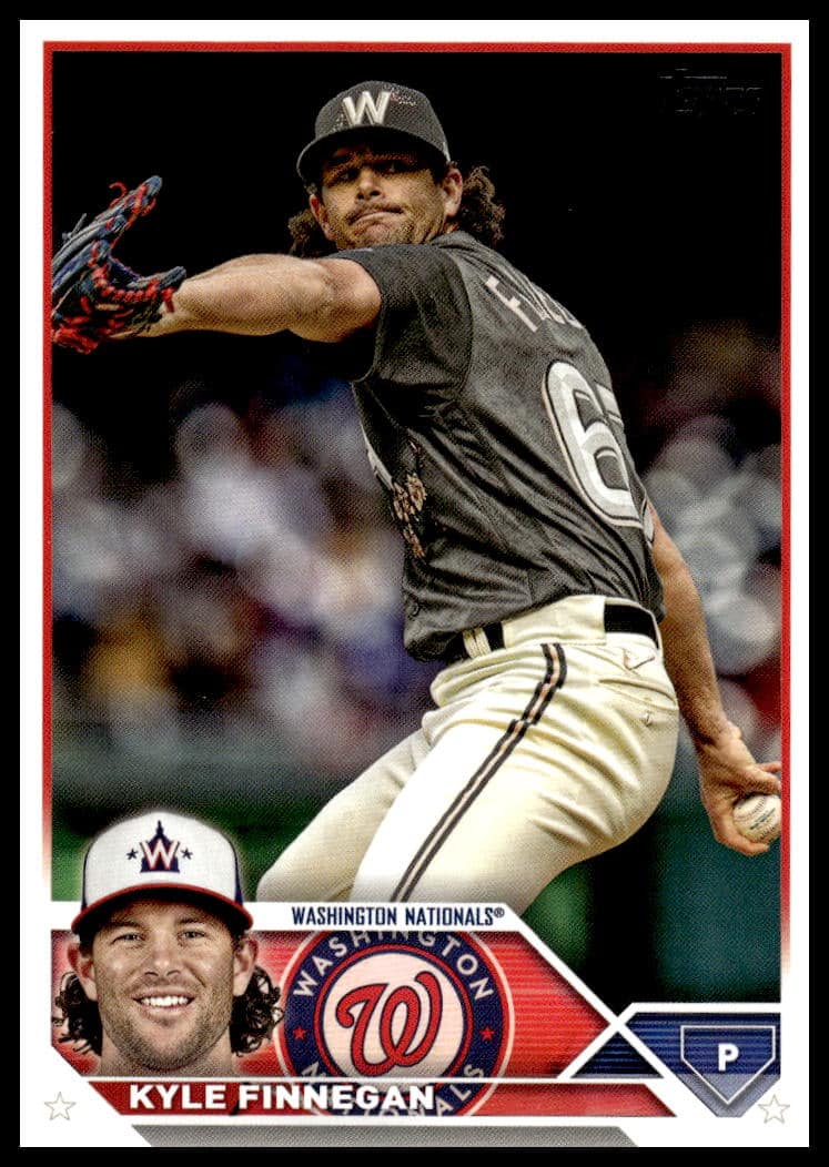 This Baseball card, from 2023 is part of the Topps Update card set. Kyle Finnegan is featured and has a card number of US249.