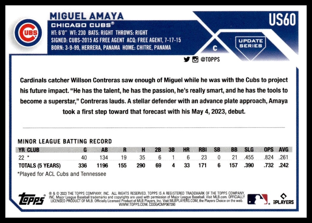 This Baseball card, from 2023 is part of the Topps Update card set. Miguel Amaya is featured and has a card number of US60.