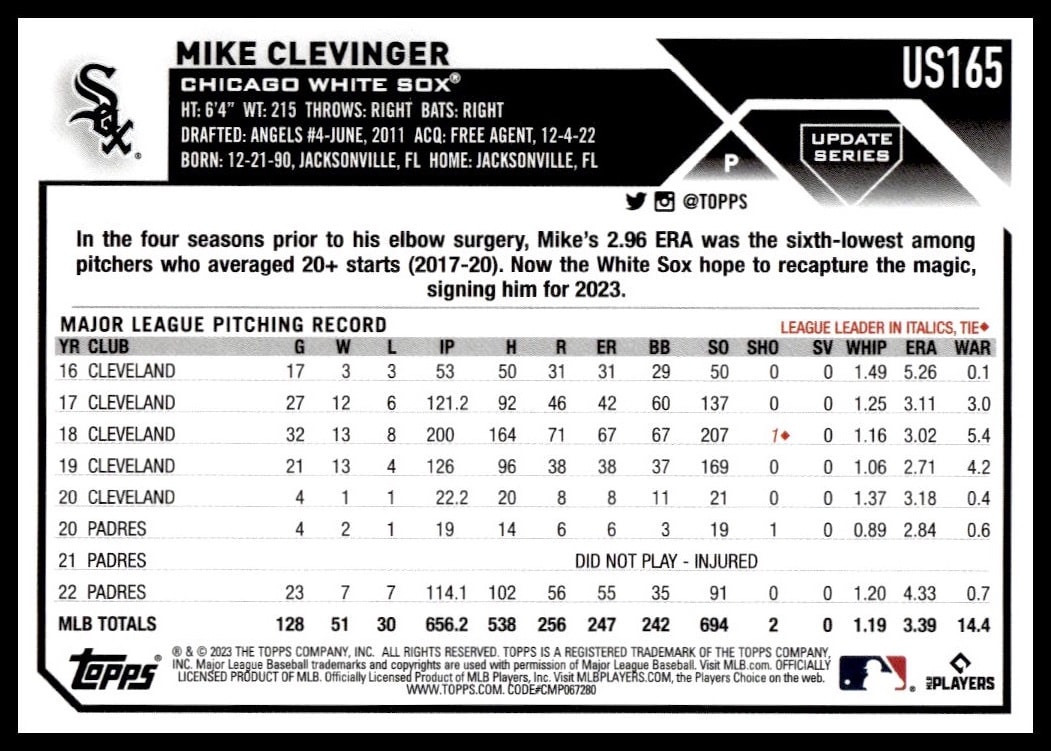 This Baseball card, from 2023 is part of the Topps Update card set. Mike Clevinger is featured and has a card number of US165.