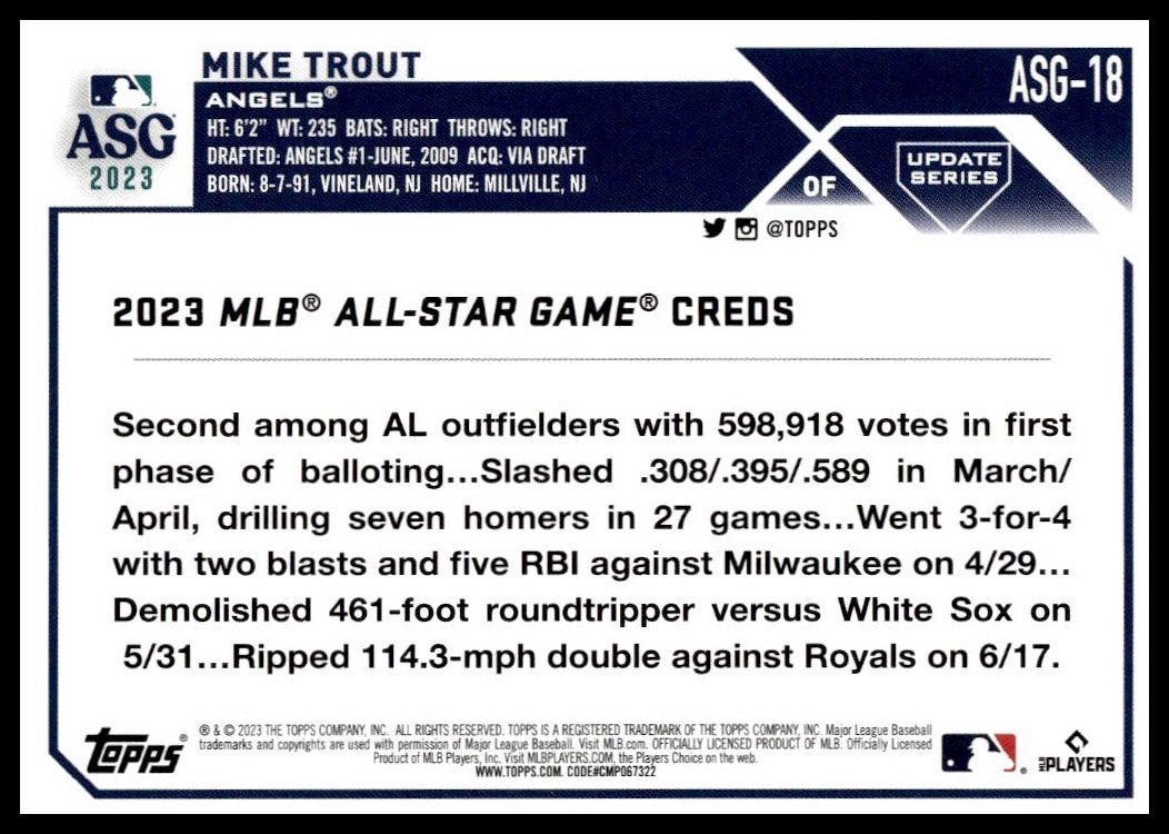 This Baseball card, from 2023 is part of the Topps Update card set. Mike Trout is featured and has a card number of ASG-18.