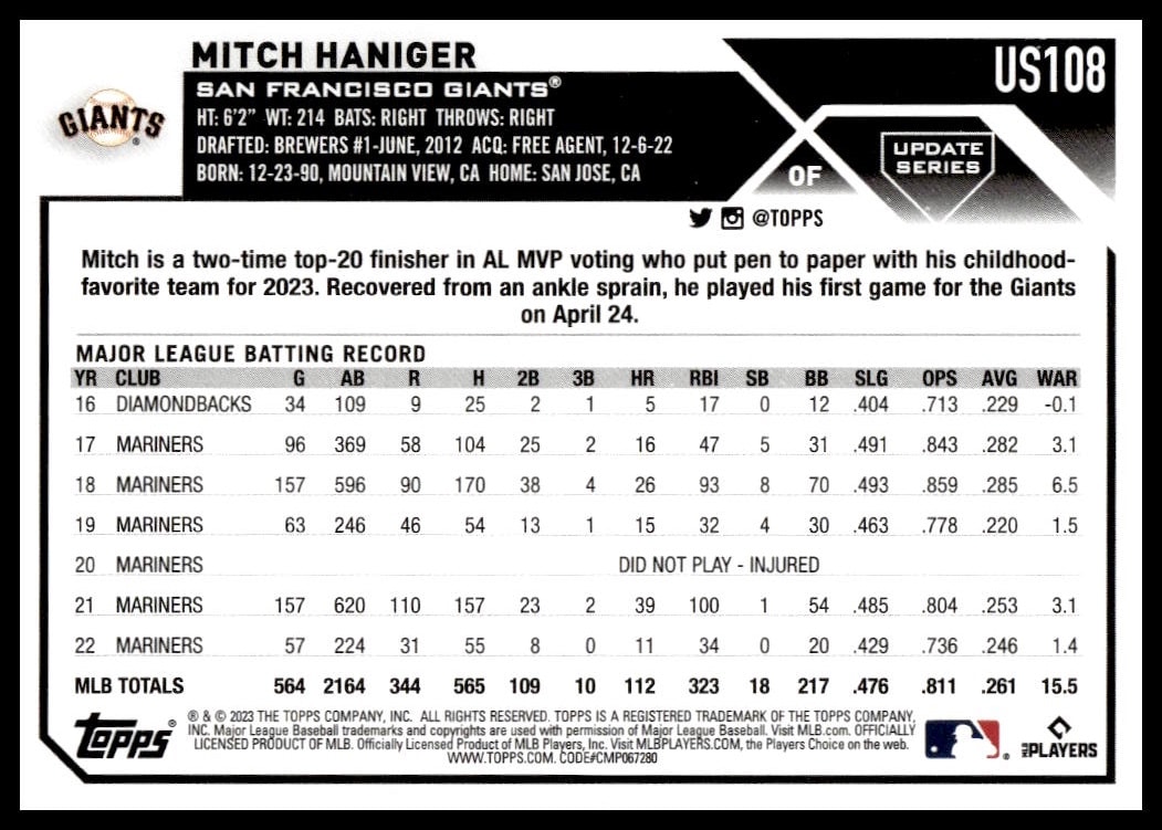 This BaseballΒ card, from 2023 is part of the Topps UpdateΒ card set. Mitch Haniger is featured and has a card number of US108.