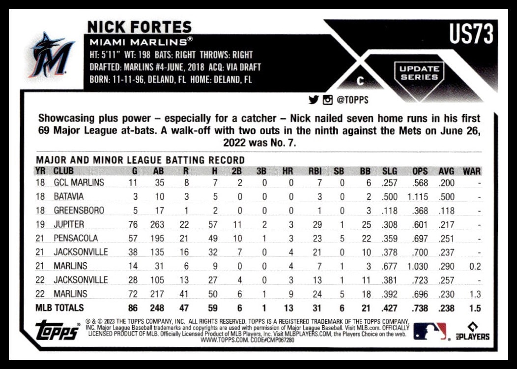This BaseballΒ card, from 2023 is part of the Topps UpdateΒ card set. Nick Fortes is featured and has a card number of US73.