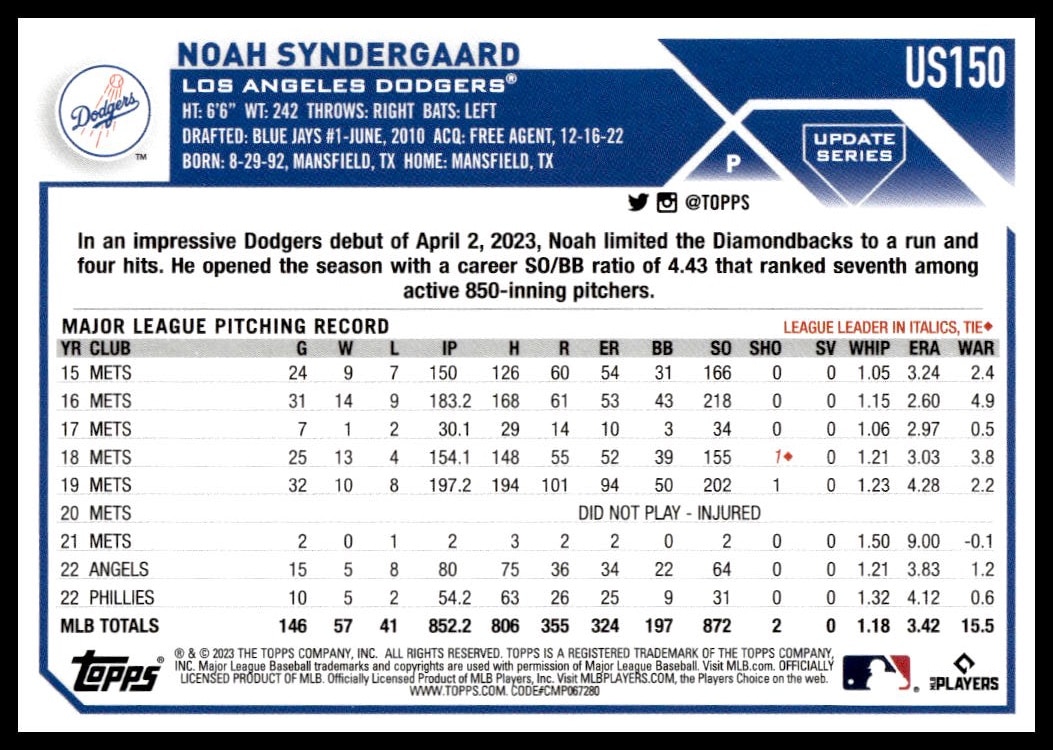 This Baseball card, from 2023 is part of the Topps Update card set. Noah Syndergaard is featured and has a card number of US150.