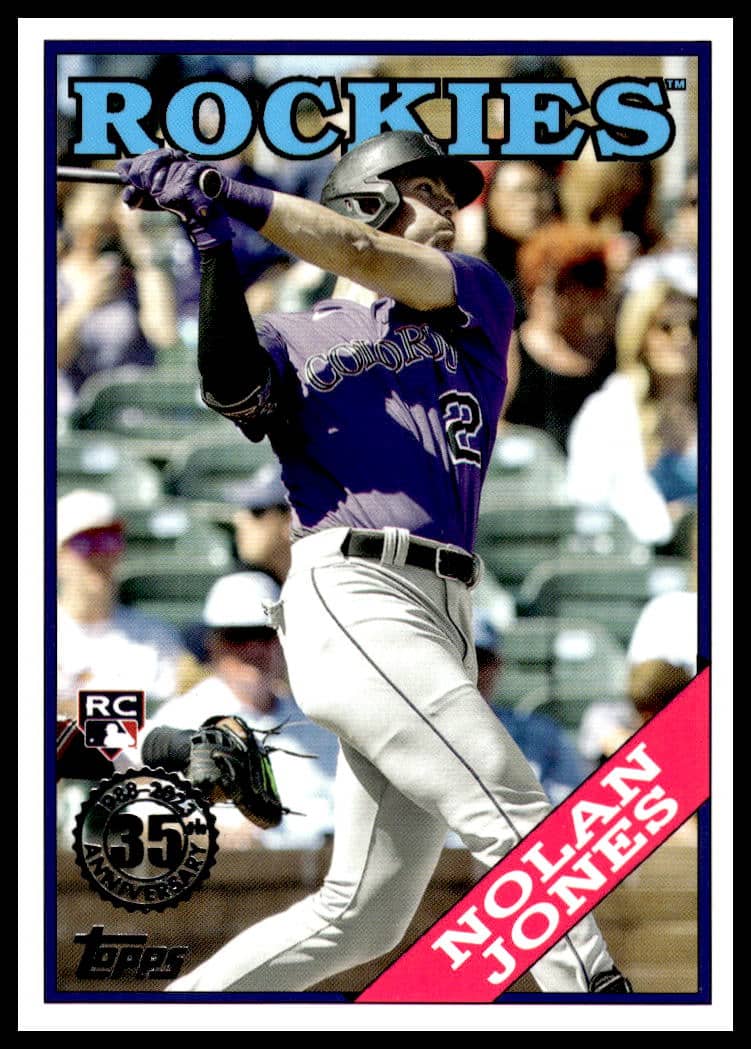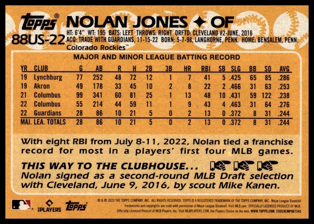 This BaseballΒ card, from 2023 is part of the Topps UpdateΒ card set. Nolan Jones is featured and has a card number of 88US-22.