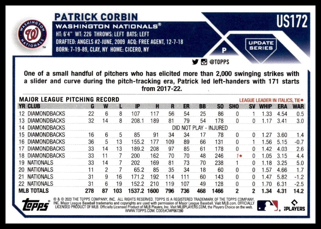 This Baseball card, from 2023 is part of the Topps Update card set. Patrick Corbin is featured and has a card number of US172.