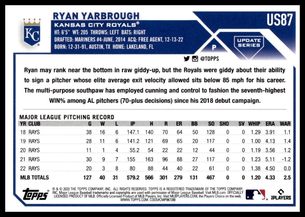 This BaseballΒ card, from 2023 is part of the Topps UpdateΒ card set. Ryan Yarbrough is featured and has a card number of US87.