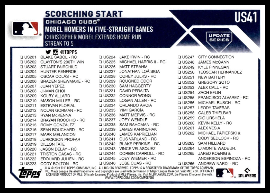 This Baseball card, from 2023 is part of the Topps Update card set. Scorching Start is featured and has a card number of US41.