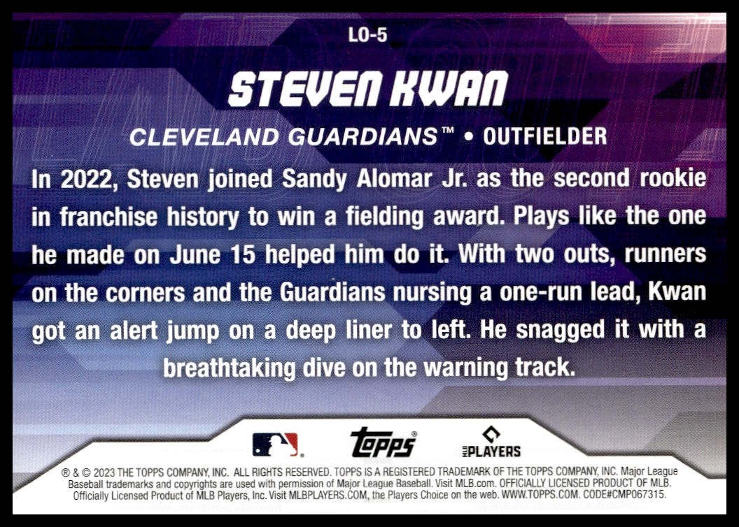 This BaseballΒ card, from 2023 is part of the Topps UpdateΒ card set. Steven Kwan is featured and has a card number of LO-5.