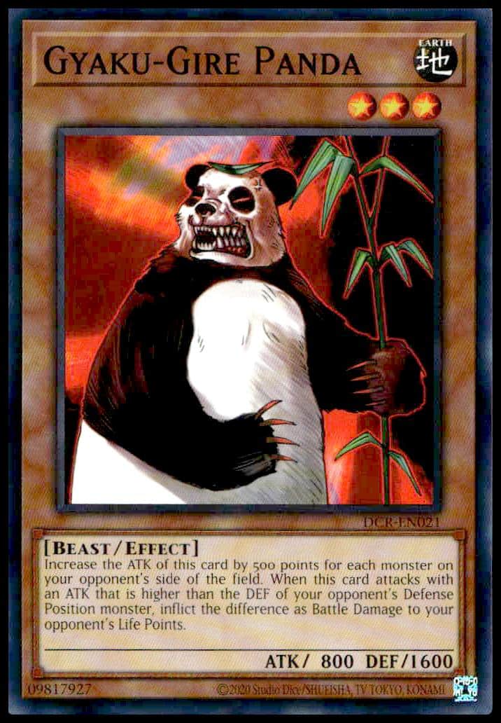 This Yu-Gi-Oh card, from 2023 is part of the Yu-Gi-Oh! Dark Crisis (25th Anniversary Edition) card set. Gyaku-Gire Panda is featured and has a card number of DCR-EN021.
