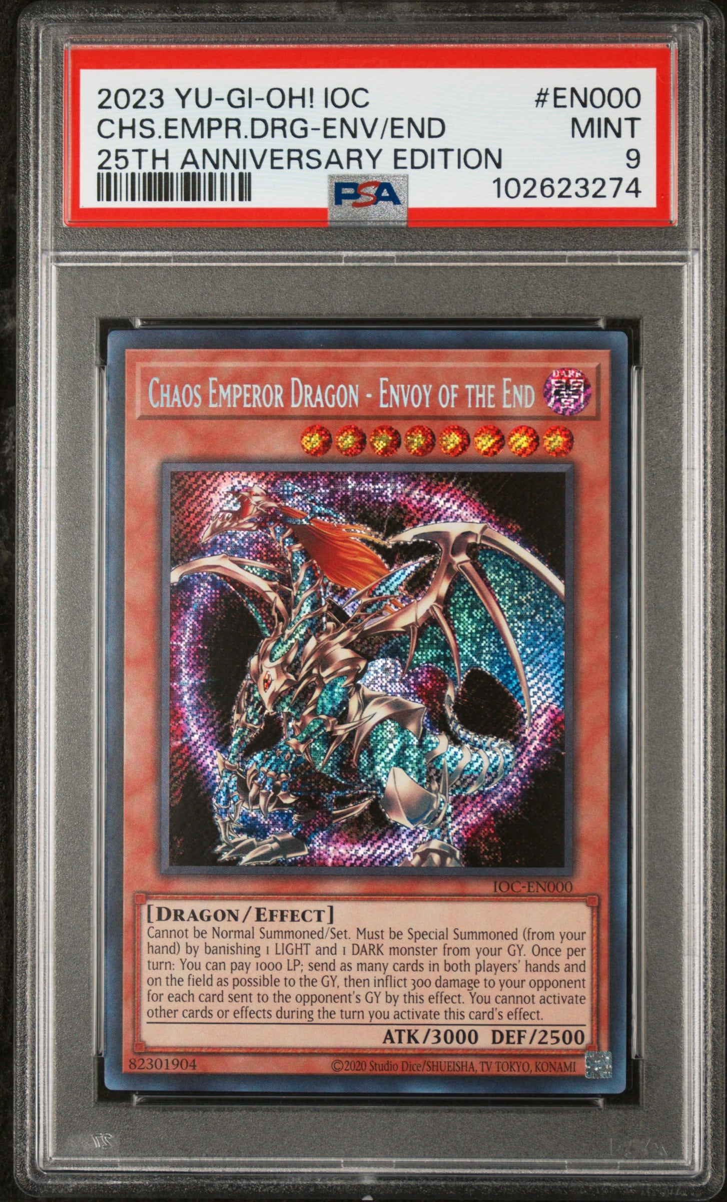 Celebrate Yu-Gi-Oh!’s 25th with the Chaos Emperor Dragon card, graded PSA 9. A must-have for collectors and fans alike!