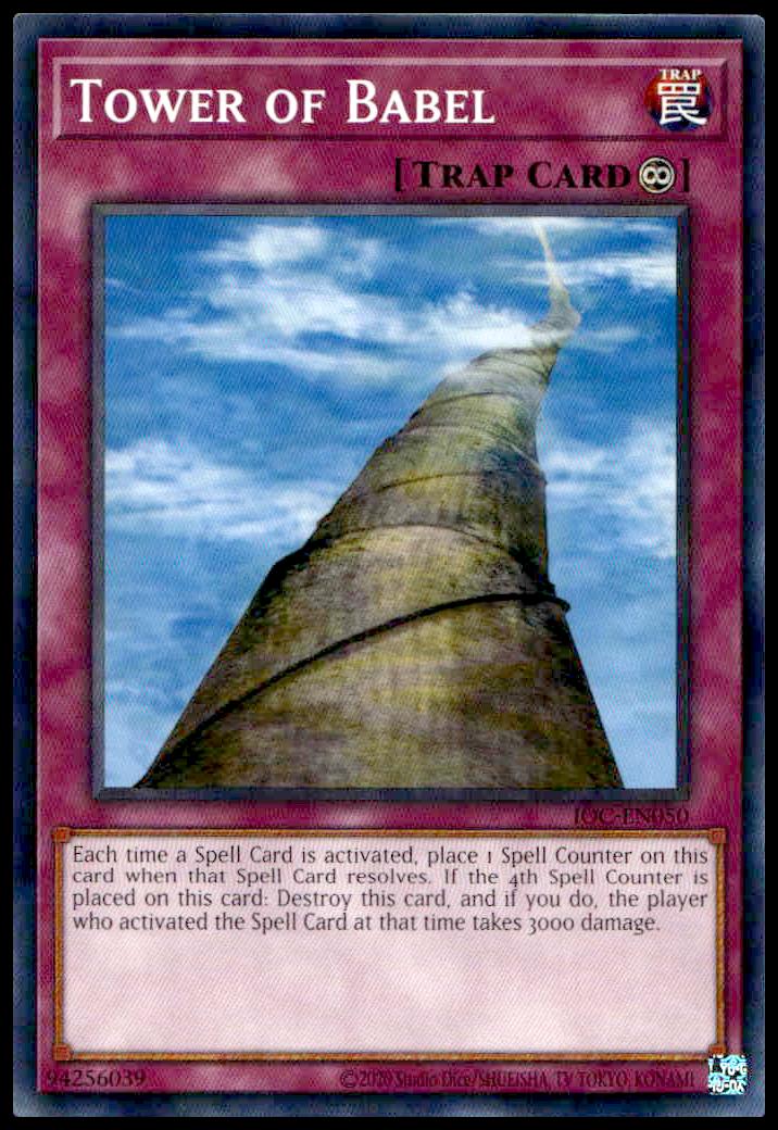 This Yu-Gi-Oh card, from 2023 is part of the Yu-Gi-Oh! Invasion of Chaos (25th Anniversary Edition) card set. Tower of Babel is featured and has a card number of IOC-EN050.