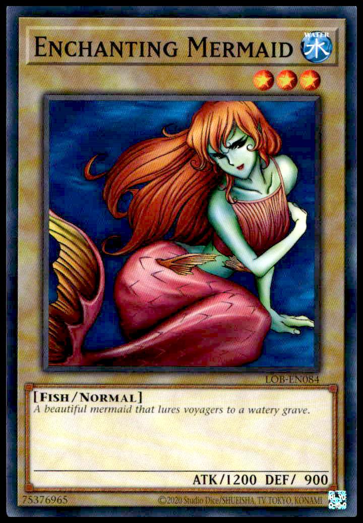 This Yu-Gi-Oh card, from 2023 is part of the Yu-Gi-Oh! Legend of Blue Eyes White Dragon (25th Anniversary Edition) card set. Enchanting Mermaid is featured and has a card number of LOB-EN084.