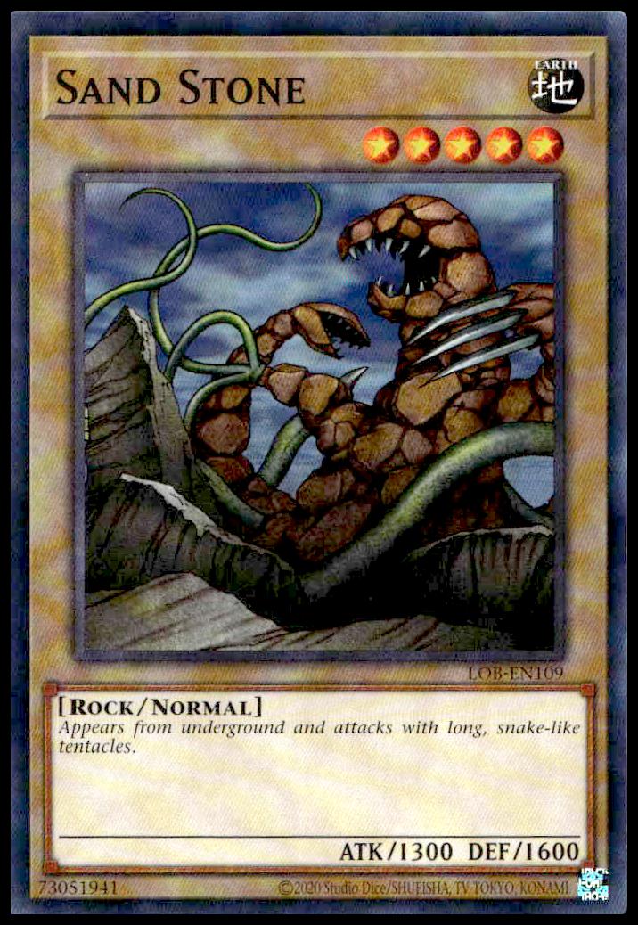 This Yu-Gi-Oh card, from 2023 is part of the Yu-Gi-Oh! Legend of Blue Eyes White Dragon (25th Anniversary Edition) card set. Sand Stone is featured and has a card number of LOB-EN109.