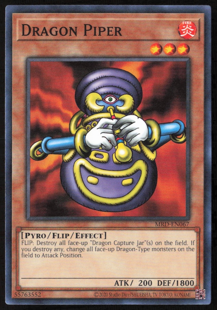 This Yu-Gi-Oh! card, from 2023 is part of the Yu-Gi-Oh! Metal Raiders (25th Anniversary Edition) card set. Dragon Piper is featured and has a card number of MRD-EN067.