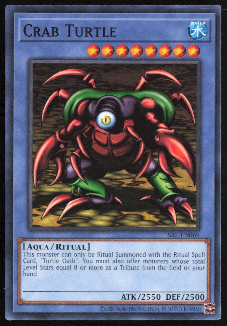 This Yu-Gi-Oh! card, from 2023 is part of the Yu-Gi-Oh! Spell Ruler (25th Anniversary Edition) card set. Crab Turtle is featured and has a card number of SRL-EN069.