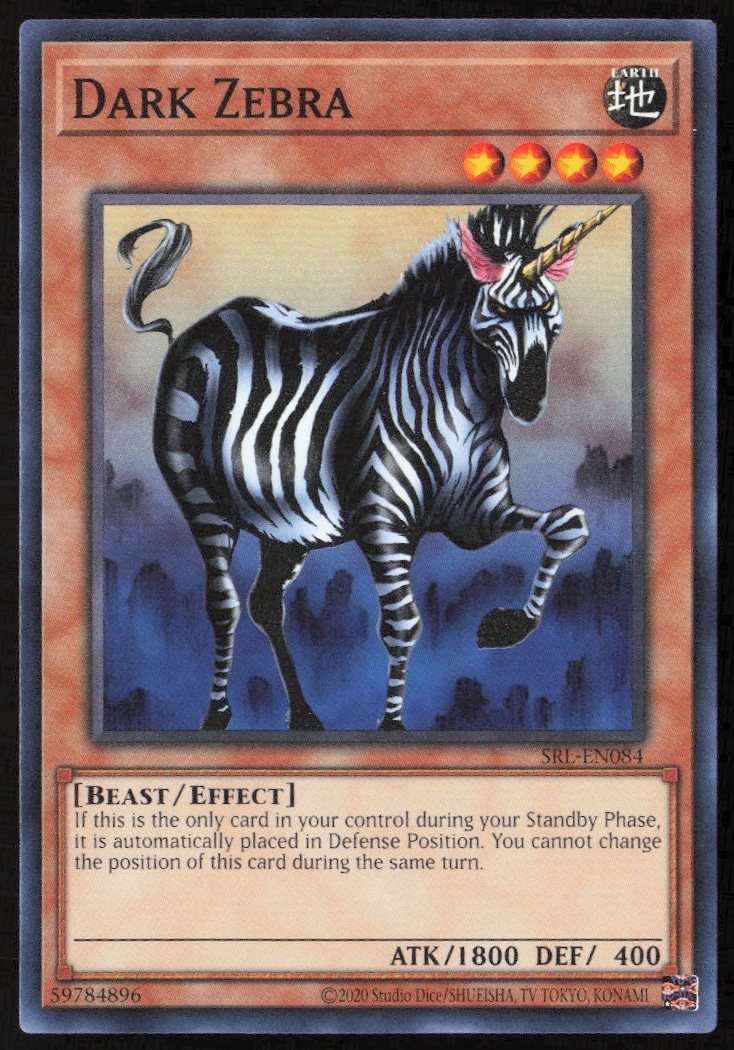 This Yu-Gi-Oh! card, from 2023 is part of the Yu-Gi-Oh! Spell Ruler (25th Anniversary Edition) card set. Dark Zebra is featured and has a card number of SRL-EN084.