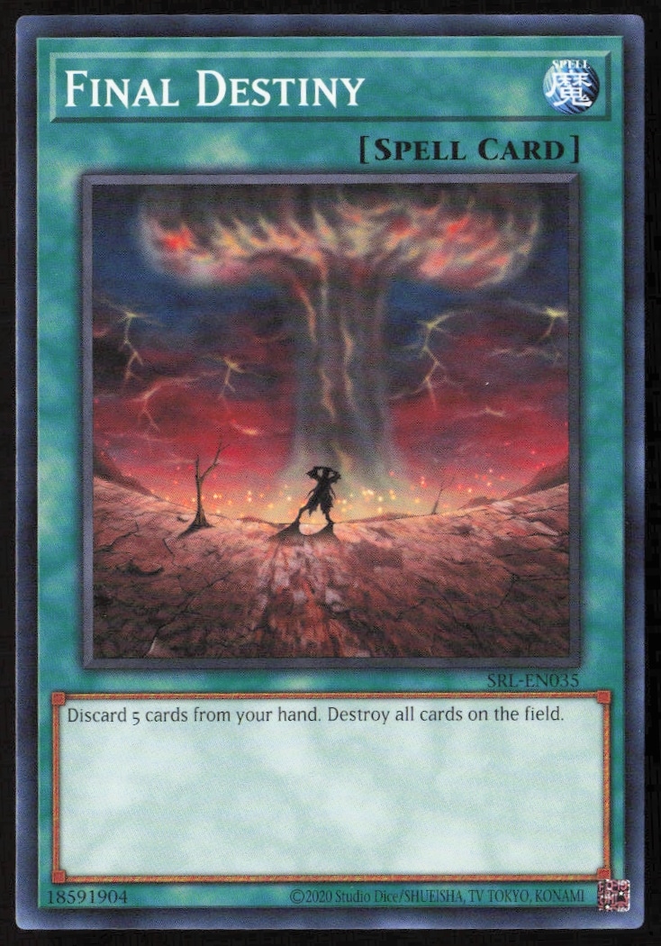 This Yu-Gi-Oh! card, from 2023 is part of the Yu-Gi-Oh! Spell Ruler (25th Anniversary Edition) card set. Final Destiny is featured and has a card number of SRL-EN035.