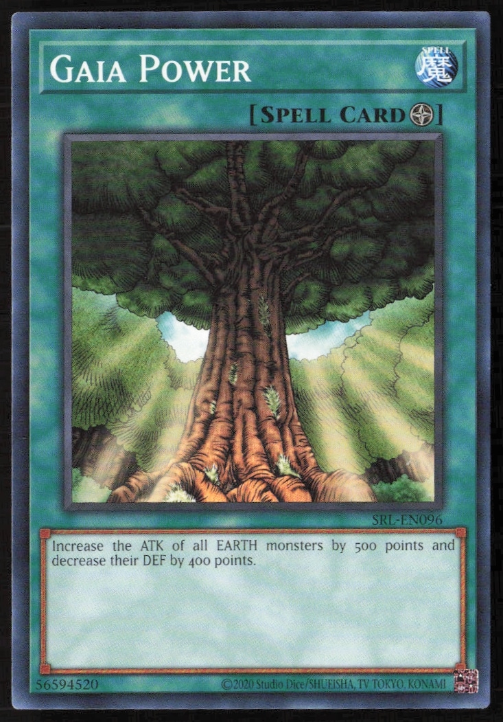 This Yu-Gi-Oh! card, from 2023 is part of the Yu-Gi-Oh! Spell Ruler (25th Anniversary Edition) card set. Gaia Power is featured and has a card number of SRL-EN096.