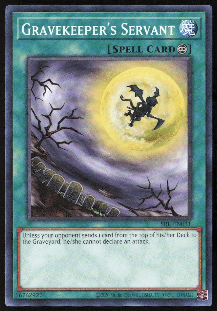 This Yu-Gi-Oh! card, from 2023 is part of the Yu-Gi-Oh! Spell Ruler (25th Anniversary Edition) card set. Gravekeeper’s Servant is featured and has a card number of SRL-EN031.