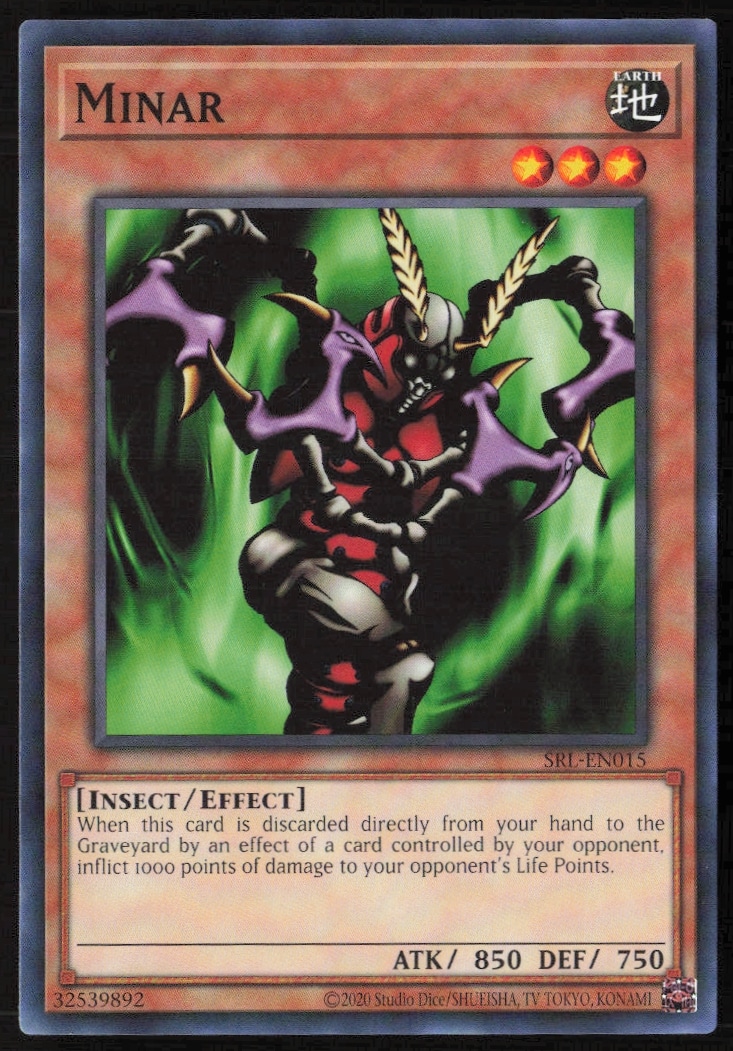 This Yu-Gi-Oh! card, from 2023 is part of the Yu-Gi-Oh! Spell Ruler (25th Anniversary Edition) card set. Minar is featured and has a card number of SRL-EN015.