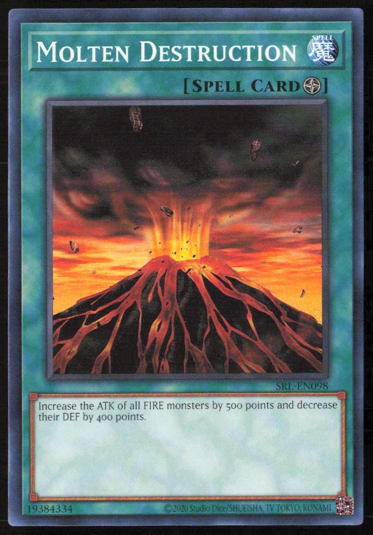 This Yu-Gi-Oh! card, from 2023 is part of the Yu-Gi-Oh! Spell Ruler (25th Anniversary Edition) card set. Molten Destruction is featured and has a card number of SRL-EN098.
