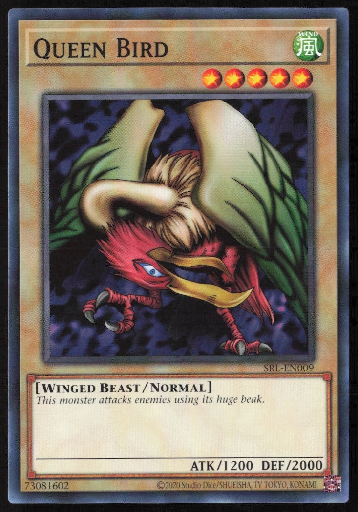 This Yu-Gi-Oh! card, from 2023 is part of the Yu-Gi-Oh! Spell Ruler (25th Anniversary Edition) card set. Queen Bird is featured and has a card number of SRL-EN009.