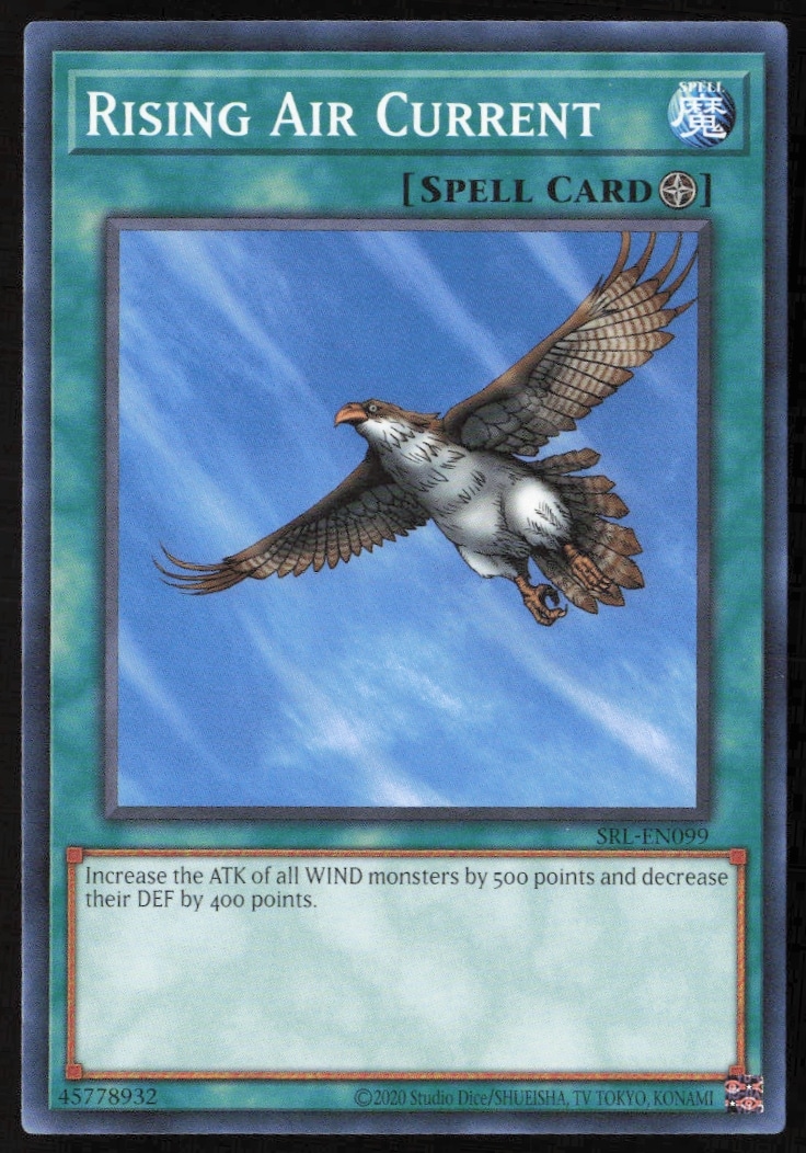 This Yu-Gi-Oh! card, from 2023 is part of the Yu-Gi-Oh! Spell Ruler (25th Anniversary Edition) card set. Rising Air Current is featured and has a card number of SRL-EN099.