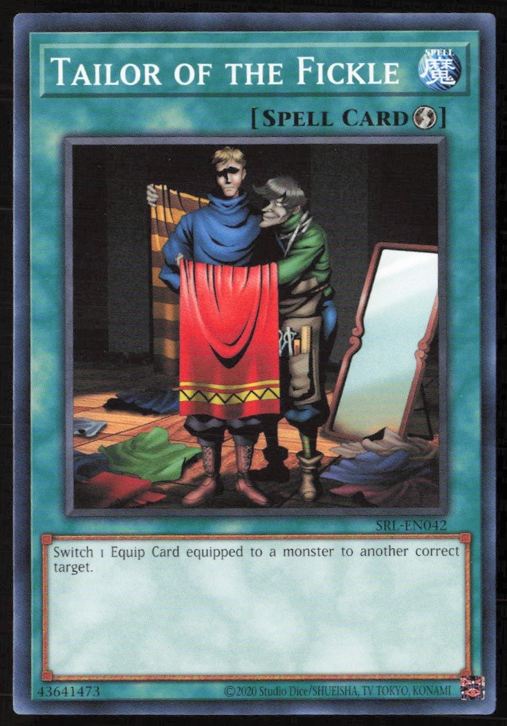 This Yu-Gi-Oh! card, from 2023 is part of the Yu-Gi-Oh! Spell Ruler (25th Anniversary Edition) card set. Tailor Of The Fickle is featured and has a card number of SRL-EN042.