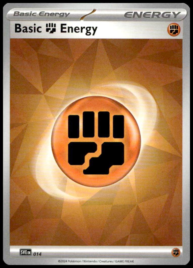 This Pokémon card, from 2024 is part of the Pokémon Scarlet & Violet: Surging Sparks card set. Basic Fighting Energy is featured and has a card number of 14.