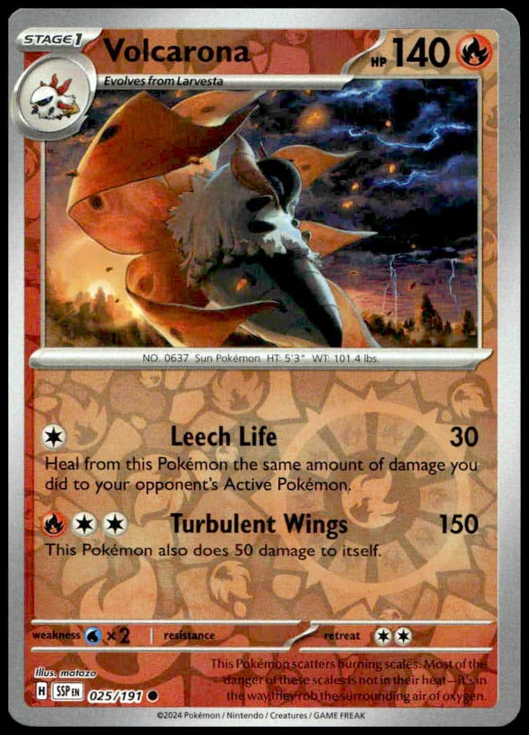 This Pokémon card, from 2024 is part of the Pokémon Scarlet & Violet: Surging Sparks card set. Volcarona is featured and has a card number of 025/191.