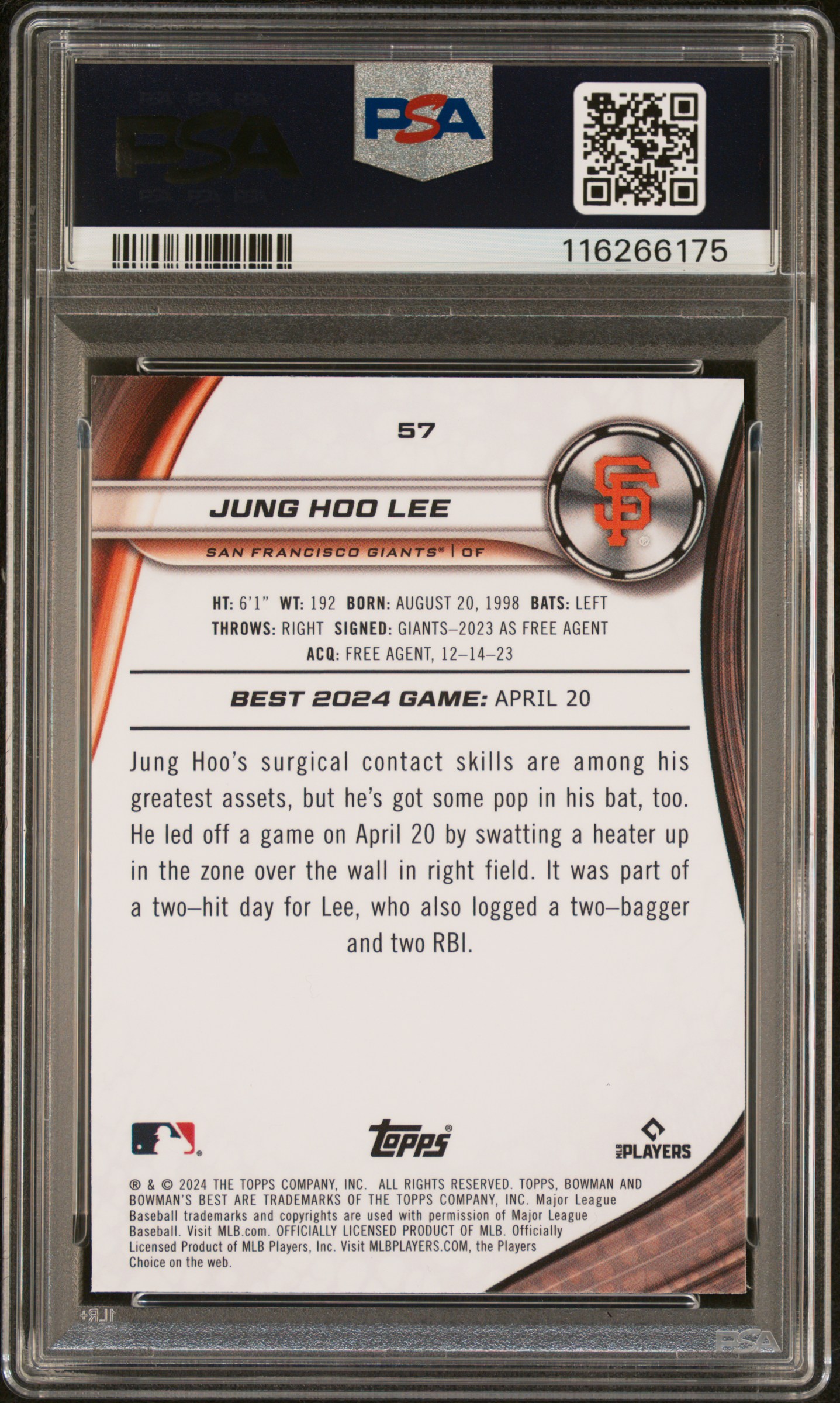This Baseball card, from 2024 is part of the Topps Bowman’s Best card set. Jung Hoo Lee is featured and has a card number of 57. It is graded by PSA and has a numeric grade of 10.