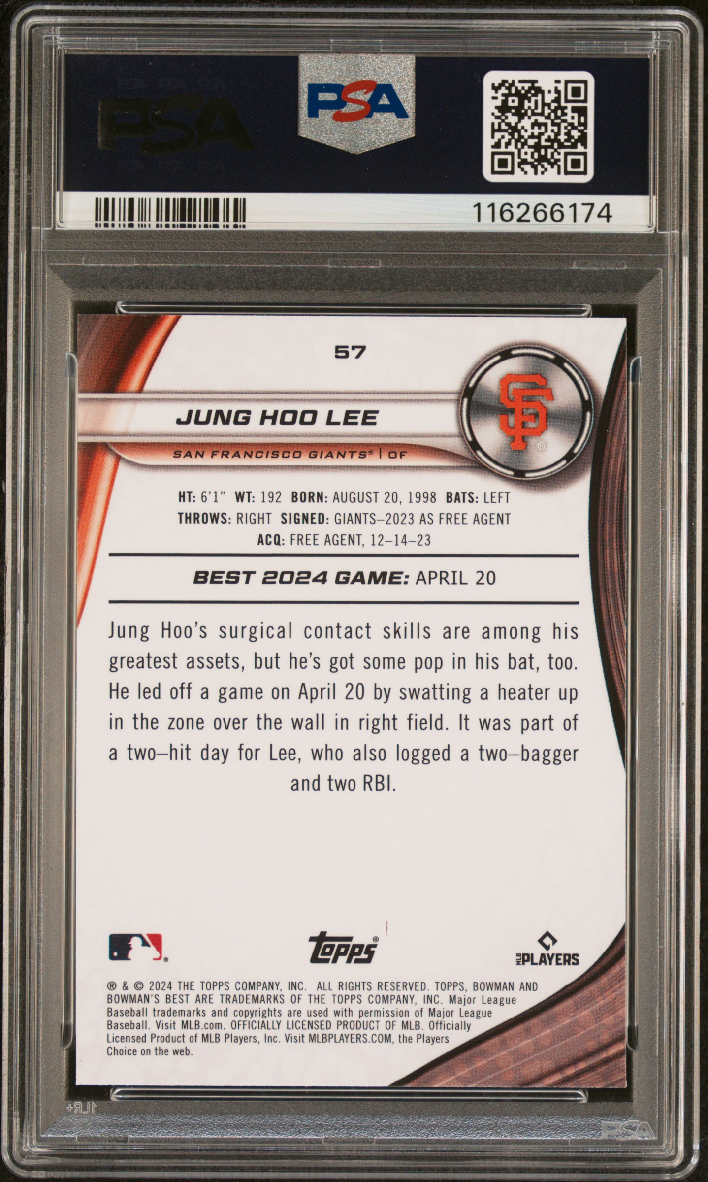 This Baseball card, from 2024 is part of the Topps Bowman’s Best card set. Jung Hoo Lee is featured and has a card number of 57. It is graded by PSA and has a numeric grade of 9.