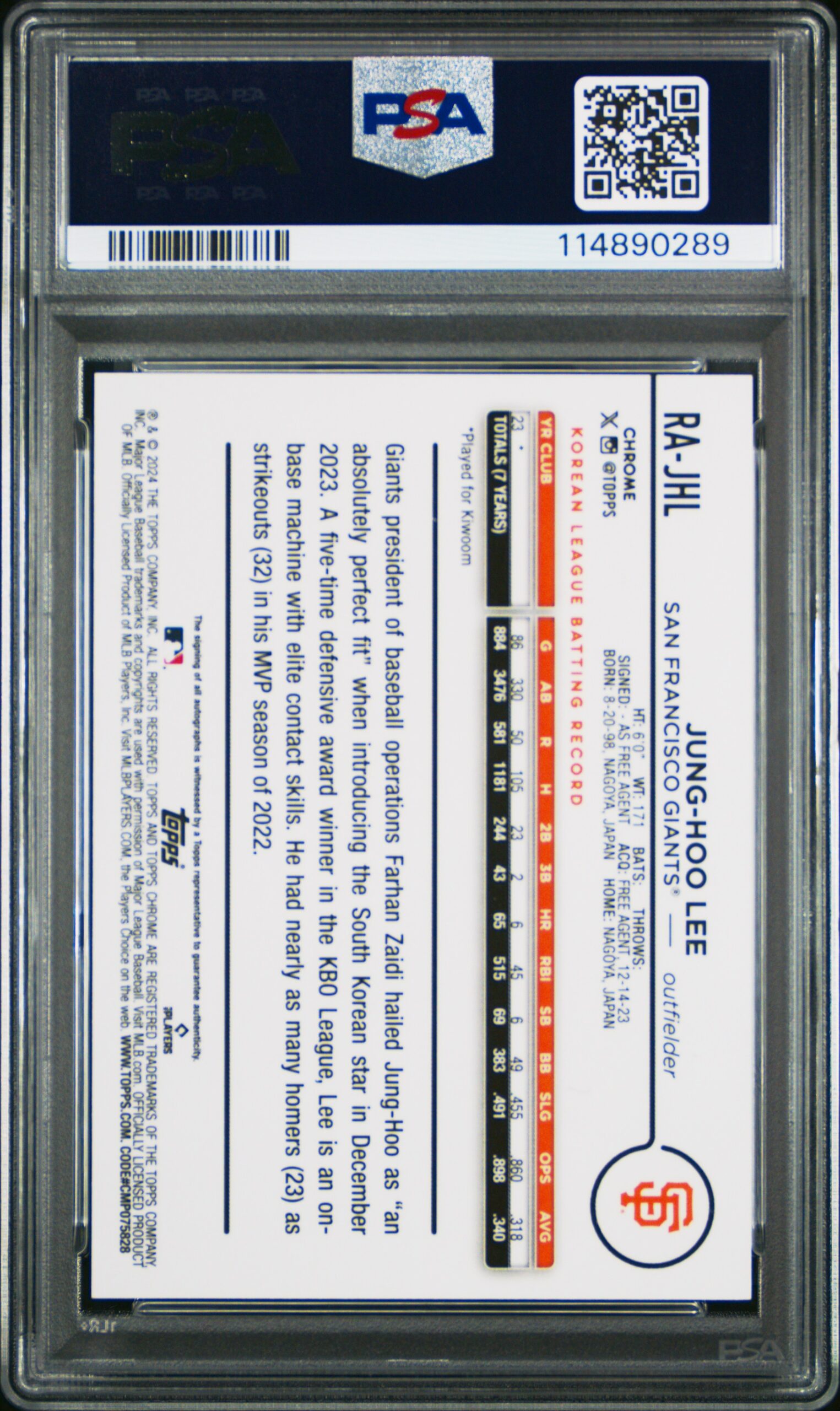 This Baseball card, from 2024 is part of the Topps Chrome card set. Jung-Hoo Lee is featured and has a card number of RA-JHL. It is graded by PSA and has a numeric grade of 9.