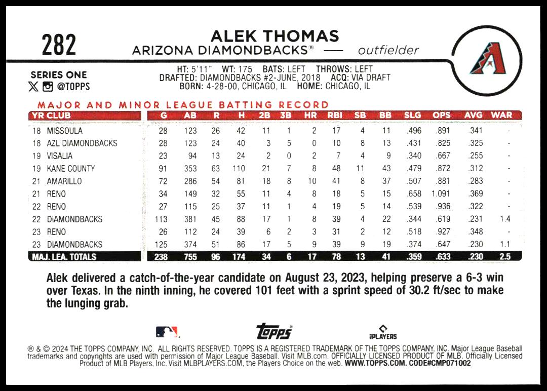 This BaseballΒ card, from 2024 is part of the Topps Series 1Β card set. Alek Thomas is featured and has a card number of 282.