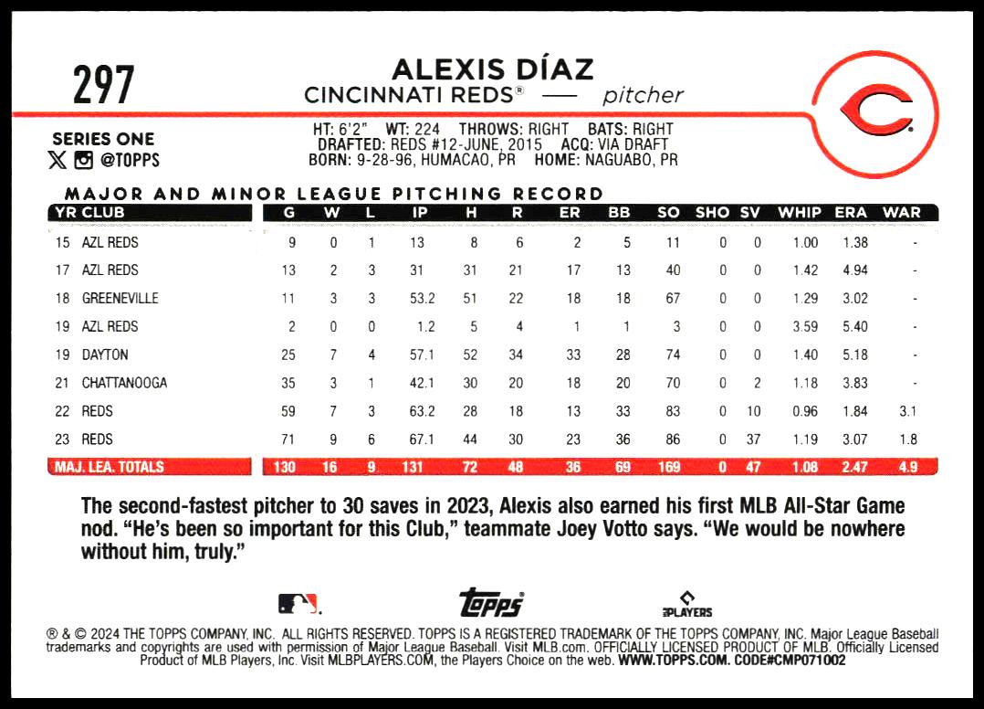 This Baseball card, from 2024 is part of the Topps Series 1 card set. Alexis Díaz is featured and has a card number of 297.