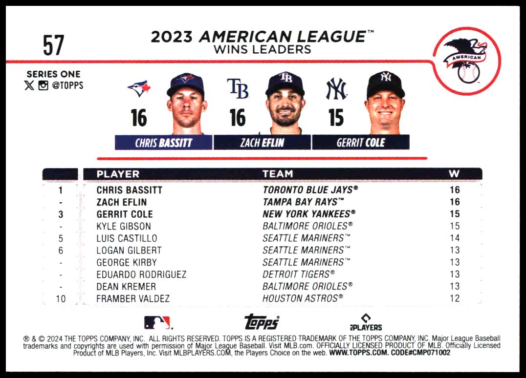 This Baseball card, from 2024 is part of the Topps Series 1 card set. American League Leaders (Chris Bassitt / Zach Eflin / Gerrit Cole) is featured and has a card number of 57.